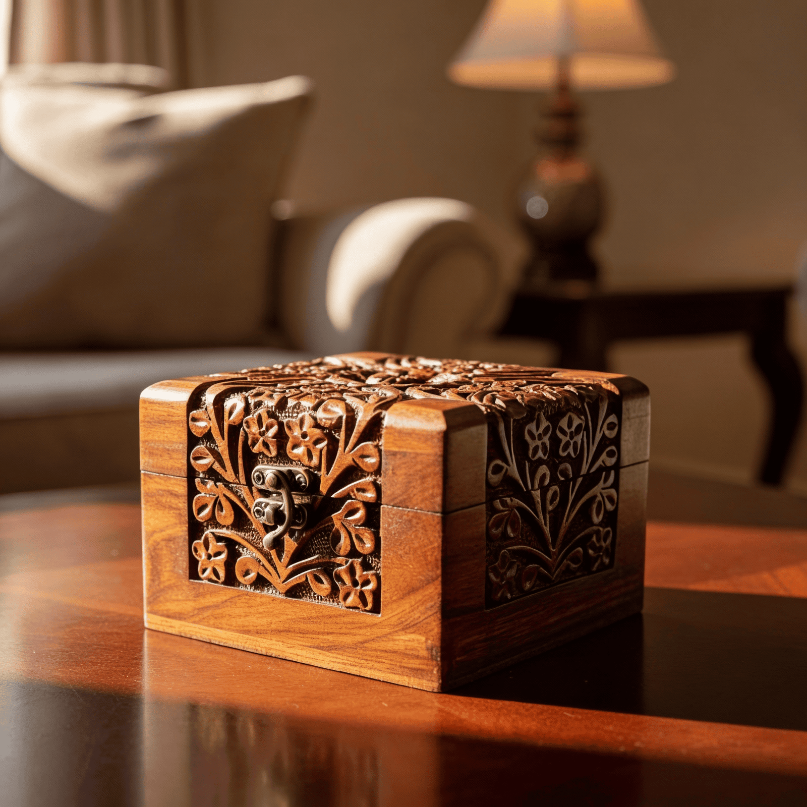 Handcrafted Wooden Jewellery Box with Intricate Full Carved Embroidery
